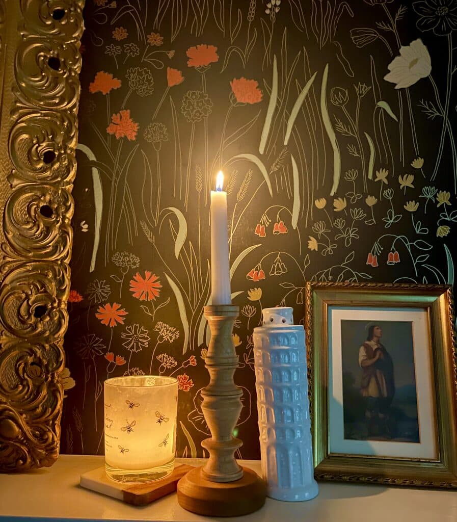 Candles bring the light indoors during the darker times of the year. I spend more time indoors during the winter months and treasure that time I have to be cozy in my living room with the fire place, plenty of candles, and books. (This gorgeous wallpaper is from Hygge & West.) Notice a theme here?
