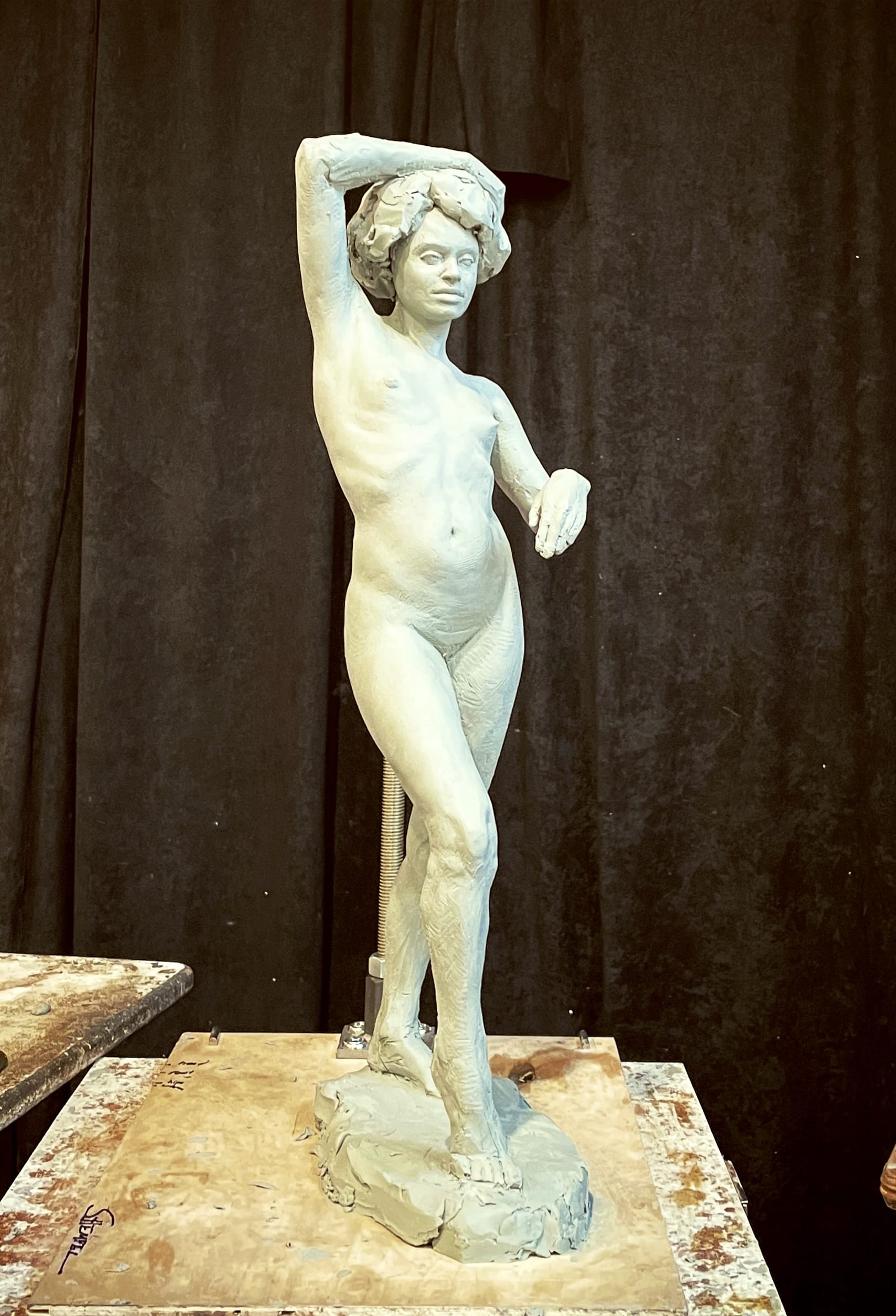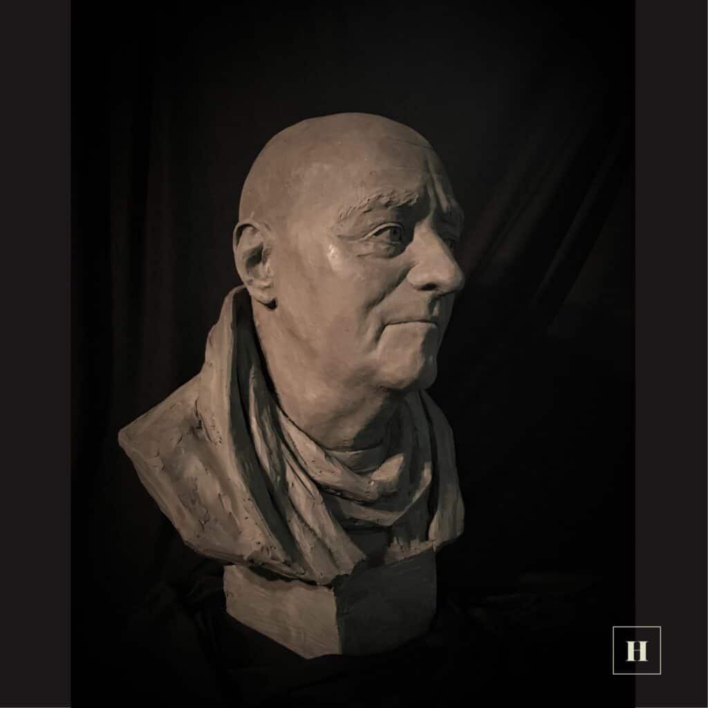 I use a darker grey-colored plastilina called Plaxtin. I bought some from Lyme Academy College of Fine Arts back I 2002, but then it seemed to have disappeared from the US market. When I went to Pietrasanta, Italy back in 2006, I bought more and now have plenty to last me forever. I love Plaxtin for it's quick work-ability and the way it grabs fingerprints and marks. It's soft and pliable and quick to build up a portrait. The downside is that it does not become softer with heat and can dry and crumble if left too long. I have been able to revive my dried out old clay by chopping it and mixing in vegetable oil. I no longer use this for larger commissions because it dries out, but prefer it for portraits.