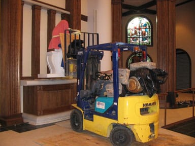 The consensus was to go with the original design and plan. Word didn't get to Andrew, the sculpture rigger, and crew until I got to the church a few hours later. They were already setting her up on the right (wrong!) side of the church. "Stop!" I whispered. "She needs to go on the other side." Apparently, the pre-consensus word to put her on the right (wrong!) side got to them, but the post-consensus word did not. Andrew was a little irked at the change of plans, "I knew you'd be pissed. Don't *@^$ with the artist's design, I always say." So, they had to drag the two ton sculpture, fork lift and pieces of plywood to the other side of the church. Again.
