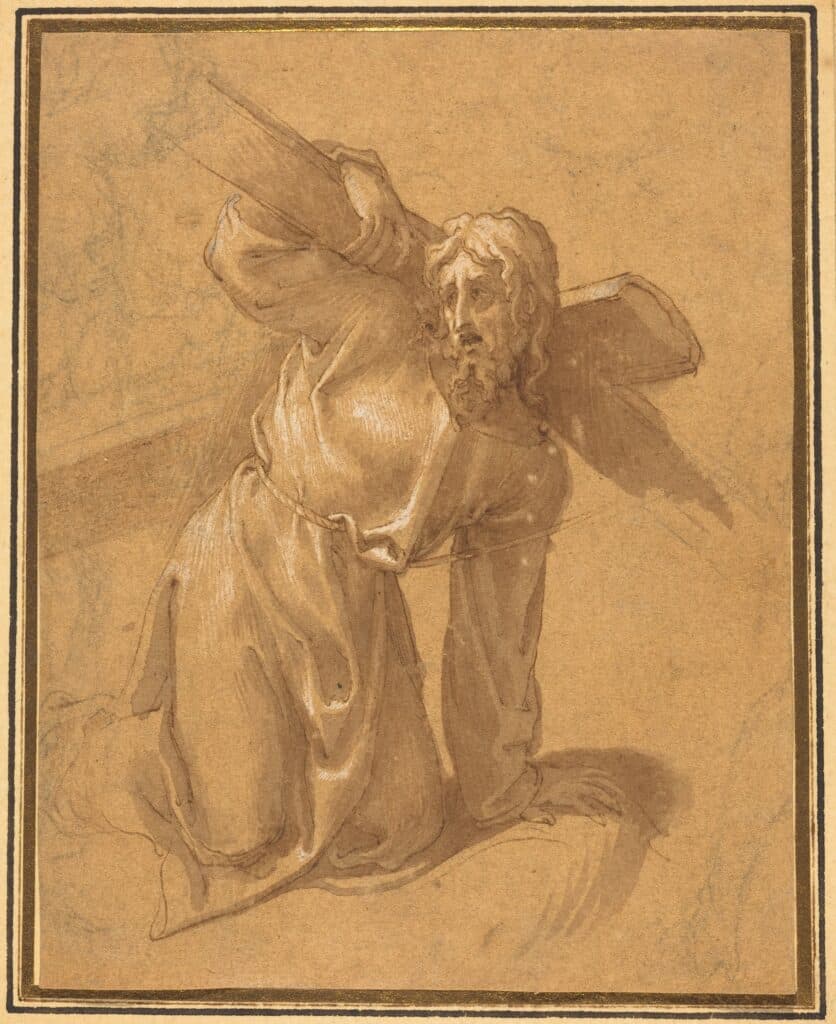 This 16th-century Italian drawing by a follower of Francesco Salviati of "Christ Falling under the Cross" was created using pen and brown ink with gray-brown wash and black chalk, heightened with white gouache on brown laid paper. It is the perfect subject matter for Lent, a season when Christians prepare for Easter. One of the spiritual exercises that many Christians do during Lent is walk the Stations of the Cross.