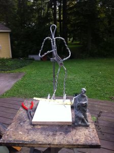 What on earth is an armature, you ask? (While I was looking around the interwebs for an article about armatures, I found Kathryn Porter's website. Nice work!) Basically, the armature is a skeleton made of bendable aluminum that holds up the clay in any position you desire. Here is a great article about armatures by a sculptor named Emily Bedard. For example, here is a picture of an armature that I used for the 18" model of St. Luke. You can see the tiny maquette I made. It was so small that it didn't need an armature!