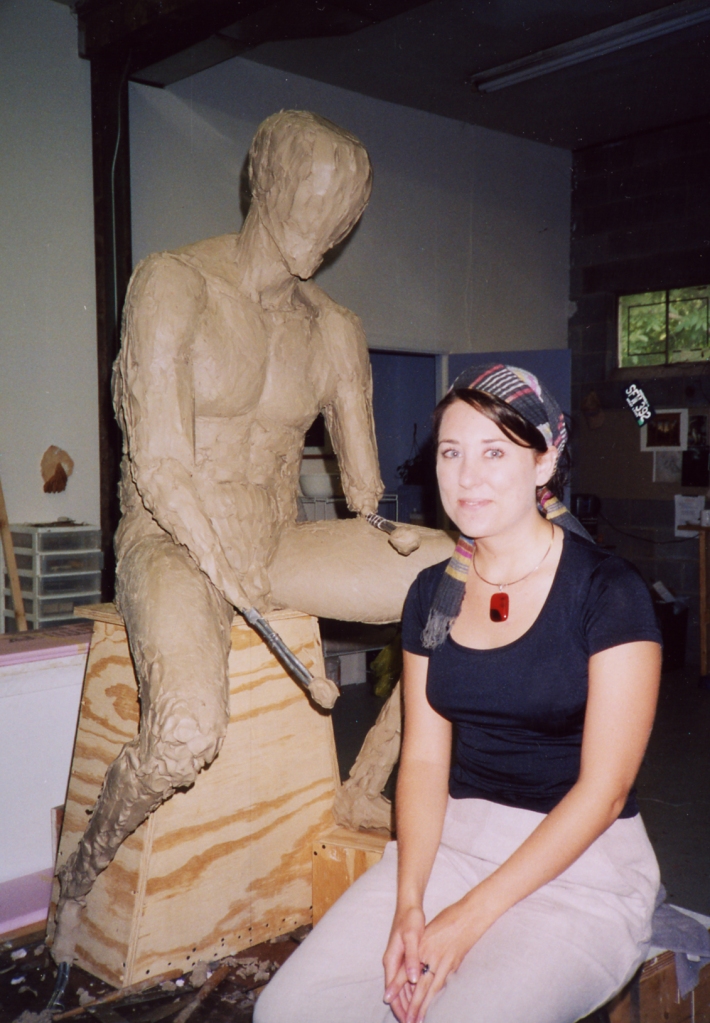 The larger a figure is, the more complicated the armature becomes. It needs to be stronger because the weight of the clay will be intense. When I was working on St. Joseph, I had to hire someone to weld an armature together. The gauge of wire was so think that I couldn't bend it myself. Here I am back in 2003/4 with the clay St. Joseph. You can see the wire poking out where his hand will be.
