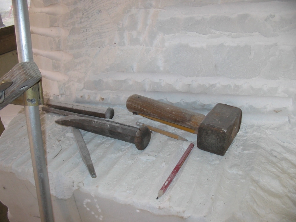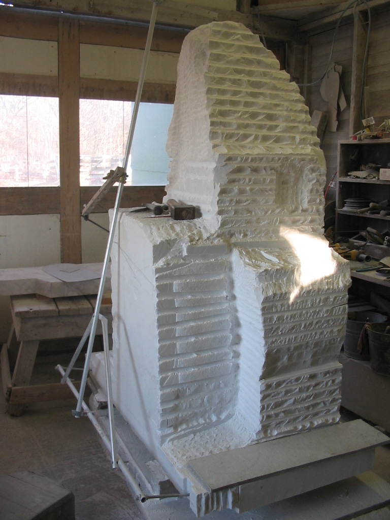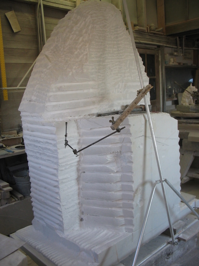In the world of sculpture, there are sculptors and there are carvers. Sculptors fashion the image in clay and provide a plaster cast, called a carver’s model, to a stone carver. This is the traditional way of working and the manner in which the Washington National Cathedral’s stone studio operated. Italian carving studios are filled with plaster casts of many different artists, while the carvers carefully copy the images in stone. In the early summer of 2004, I sent the carver’s model of the Virgin Mary to Malcolm Harlow, a stone-carver in Virginia who worked at the Cathedral for many years. We also sent him nine tons of marble, imported from theCarraraMountainsinItaly. Once the stone and plaster were at the studio, Malcolm began the process. He worked for two years, gently chipping away the pieces of Italian marble until he revealed the image I created of the Mother of Our Savior.
