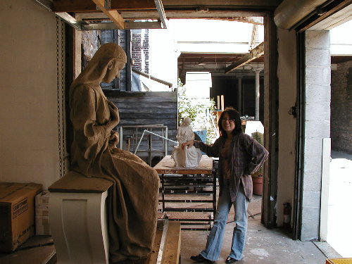 The process took several weeks, so I used the time to move to a new studio. My lease was up at the current studio and the landlord was renovating. After searching for nearly a year, I found the perfect space for rent just down the street. As soon as I saw the old mechanic’s shop, I squealed with delight. This was my dream studio! It had twelve-foot ceilings, a garage door. It even had an upstairs with an office and a bedroom; I eventually moved into the studio and lived there for two years. Once I was moved in and things were cleaned and painted, I brought the four-hundred pound clay sculpture of the Virgin Mary back from Baltimore to finish the work. The finishing work on the Virgin Mary went on for nearly a year. Using my fingers and wooden tools, I carefully articulated every last detail, from the texture of her garment to her fingernails.