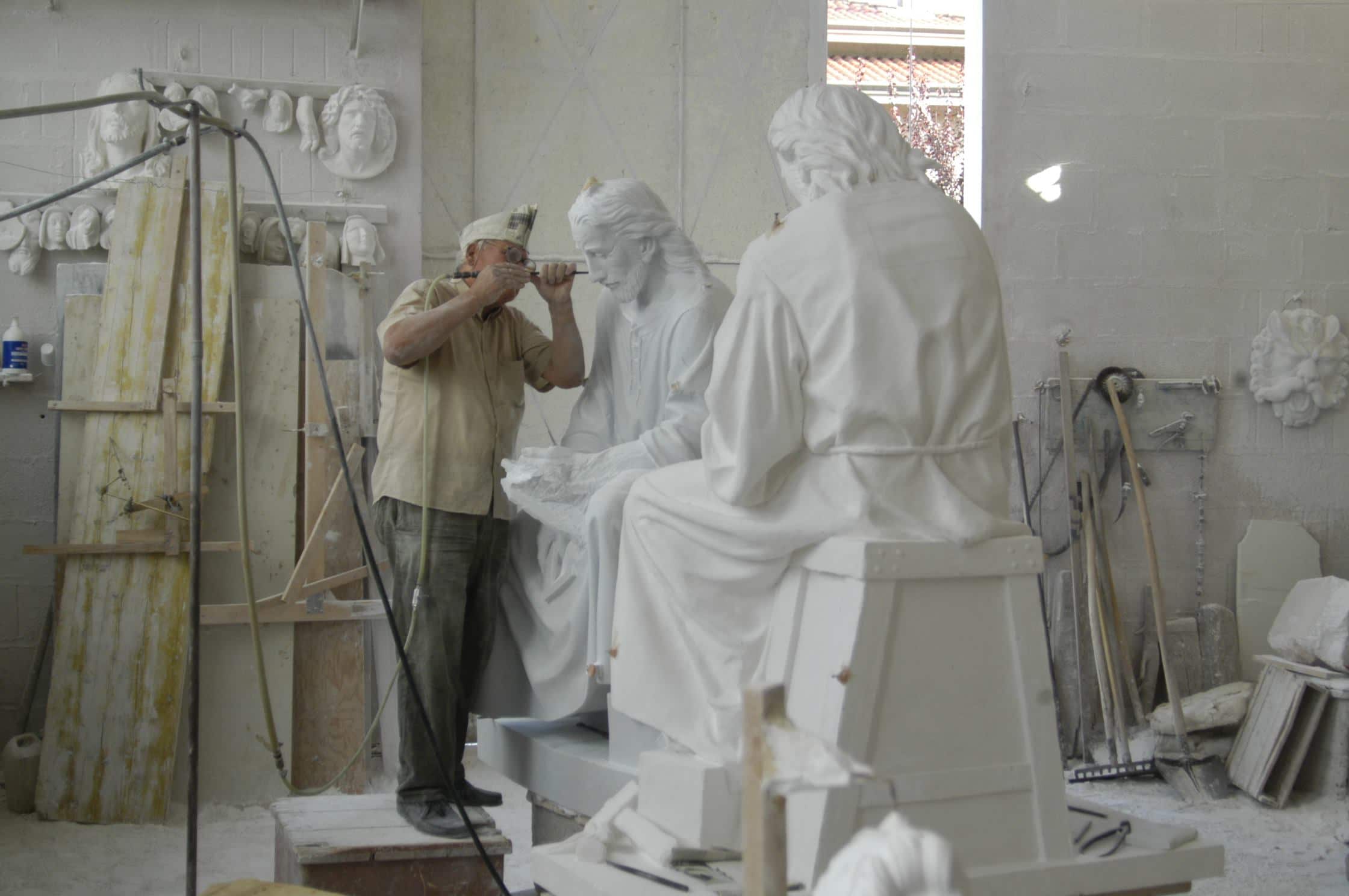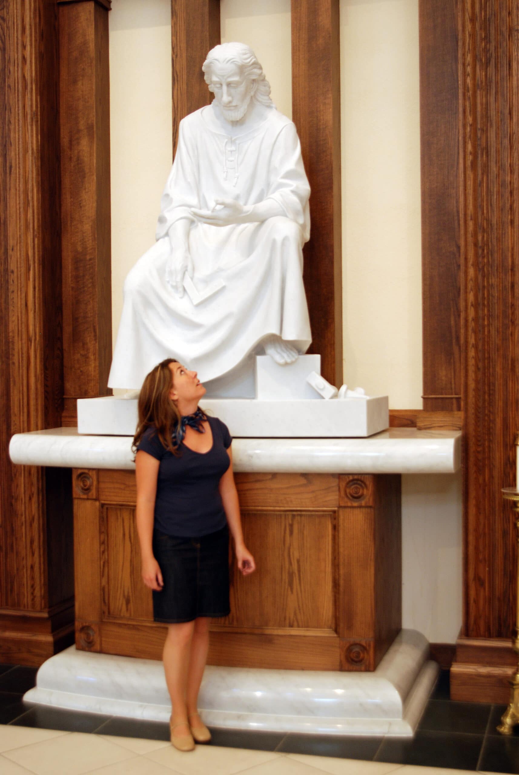 Truly, nothing is impossible with God. I finished the clay sculpture just before our wedding in October, 2005! Since the carver in Virginia was working on the sculpture of the Virgin Mary, I sent the plaster of St. Josephto a carving studio in Pietrasanta, Italy. Then in September the following year, my husband and I took the trip of a lifetime. We flew to Rome and made our way north to Pietrasanta to meet the carvers and oversee some of the finishing work on the sculpture at Studio Antognazzi. While we were in Italy, I wept at the feet of Michelangelo’s Pieta, marveled at the sight of his David, and was humbled to be a part of such a tradition.
