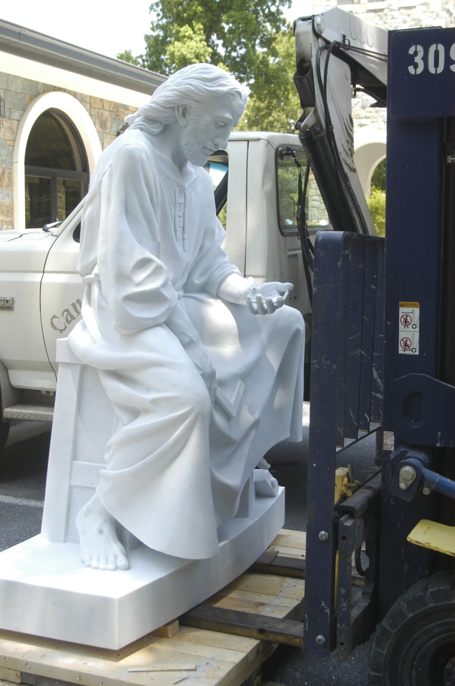 Once the sculptures were finished at the respective carving studios, the next task at hand was to deliver them to the church. It is no small feat to transport and set two and a half tons of marble! I hired a crew and we had plenty of volunteers come out to Berryville to help move the Blessed Virgin out of the studio and load the sculpture onto a truck. It took us half a day to load the truck and the rest of the week to figure out how to get the sculpture onto the niche. Once we had the logistics resolved, installing St. Josephwas a snap. It was importing the marble sculpture from Italy that proved to be the challenge. After nearly five years, the sculptures are complete. Now all we had left to do is celebrate.