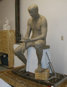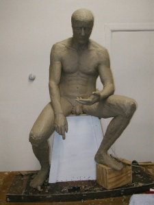 There are a few ways to enlarge a sculpture. With St. Joseph, I had the sculpture roughed out by another artist at my studio, just as I had roughed out and enlarged sculptures for Jay Carpenter when I worked as his assistant. Many sculptors will enlist the help of assistants to save time and energy. The making of a sculpture on a large scale is very physically intensive; and for a woman with fibromyalgia, a muscle disease that causes a lot of pain and fatigue, enlisting the help of others is an act of survival. My assistant built an armature by welding steel pipe together and incorporating thick aluminum wire for the arms and legs. Then I had a model come to the studio so the sculpture could be articulated as a full-scale nude. He did this for the sake of accuracy; Jay Carpenter he told me that if I did not do it this way, the sculpture will end up looking like a pile of laundry with a head!