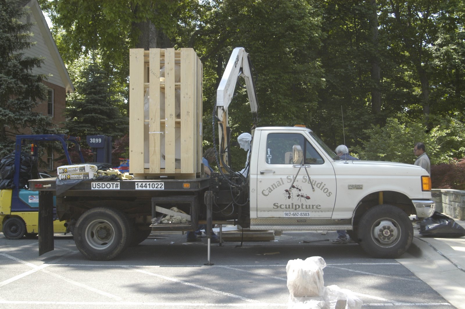 Andrew Logan of Canal Street Studios and his team transported St. Joseph from the harbor in New York to Washington,DC. He loaded the several ton sculpture onto a forklift and set it in place in Our Lady of Mercy.